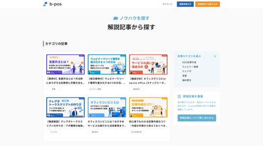 営業・テレアポやSEO記事作成など、各領域の内製化のためのノウハウ、成果を向上させるためのノウハウを探すことができます。各領域のプロフェッショナルが監修し、監修者独自のノウハウが詰まったコンテンツとなっているため、b-pos内でしか得ることのできないナレッジを見つけることができます。