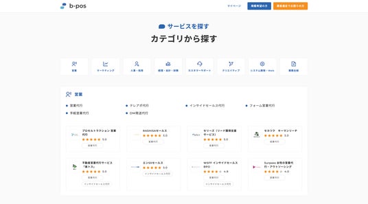b-pos内に掲載している代行・外注サービス一覧、営業やマーケティング、採用・人事などの各領域のサービス比較記事から最適なサービスの選定が可能です。