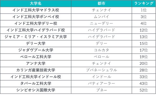 アイセックインド支部と連携している大学例 ※ランキングの出典:インド政府教育省が発表した国内大学ランキングの順位