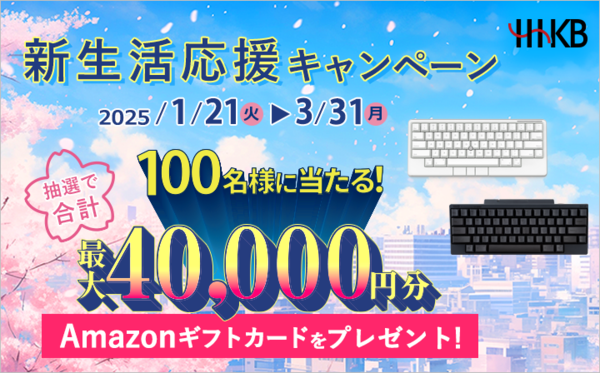 なお、HHKBスターターキットを購入することで、3月31日まで開催中のHHKB新生活応援キャンペーンに応募できる。対象のHHKBを購入・応募した人のなかから抽選でAmazonギフトカード4万円分が10名、2000円分が90名に当たる。