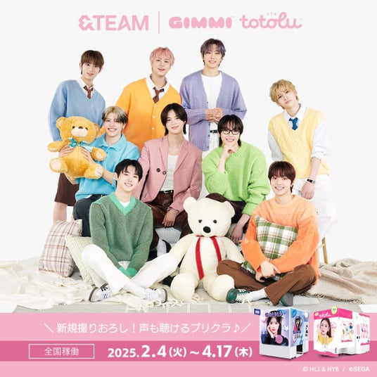 セガグループの株式会社セガ フェイブ(本社:東京都品川区、代表取締役社長執行役員:杉野行雄)は、本日2025年2月4日(火)より好評稼働中の『GIMMI(ギミ)』と『totolu(トトル)』において、国内外問わず絶大な人気を集めている「&TEAM」との期間限定イベントを全国の『GIMMI』『totolu』設置店舗にて開催します。