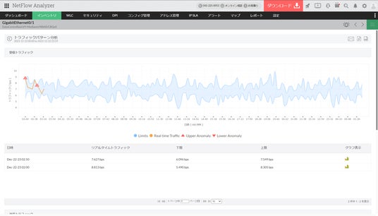 過去のトラフィックデータを基に、AIを用いて将来のトラフィック量を予測する機能です。トラフィック傾向の把握や、ネットワークに関する問題が起きた場合の原因究明に活用いただけます。トラフィック量が予測範囲を外れた場合に、トラフィック量が異常に増えた、あるいは減ったとしてアラートで検知することも可能です。