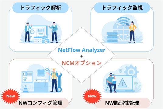 トラフィック解析ツールのNetFlow AnalyzerにNCMオプションを追加することにより、ネットワークで流れるトラフィックの把握と、ネットワーク設定の管理を一元的に行えるようになり、管理業務のさらなる効率化が可能となりました。