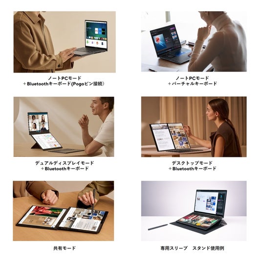 「ノートPCモード」はBluetoothキーボードをセカンドディスプレイ上に配置しPogoピンで接続することで、従来のノートPCと変わらない操作性を再現できるモードです。*専用スリーブに合わせた使用シーンの追加