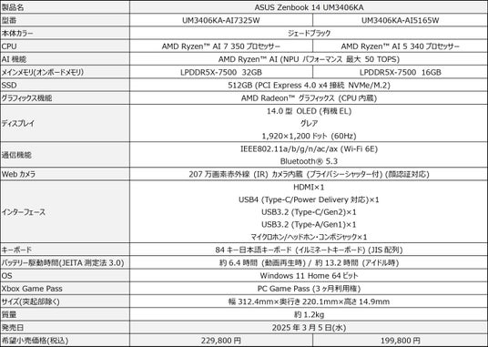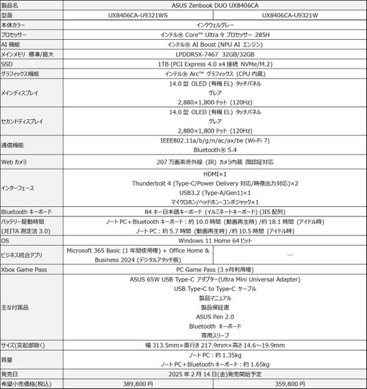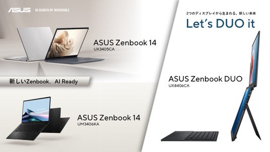 ASUS JAPAN株式会社は、最新のインテル(R) Core(TM) Ultra 9 プロセッサー 285Hと2つの14型有機ELディスプレイを搭載し、デュアルスクリーンモードやデスクトップモードなど、様々なスタイルで使用できる、革新的なデュアルディスプレイノートPCの「ASUS Zenbook DUO UX8406CA」と、インテル(R) Core(TM) Ultraプロセッサー(シリーズ2)を搭載した14型ノートPC「ASUS Zenbook 14 UX3405CA」と、最新のAMD Ryzen(TM) AI 7 350プロセッサー、または、AMD Ryzen(TM) AI 5 340プロセッサーを搭載した14型ノートPC「ASUS Zenbook 14 UM3406KA」の3製品計15モデルを発表いたしました。2月14日(金)より順次発売開始となります。