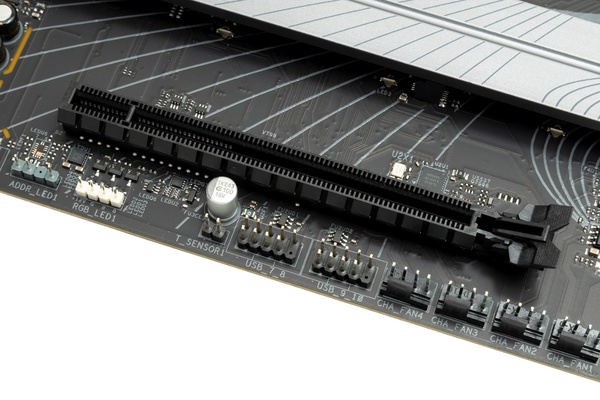 そのほか、8666MHz駆動に対応するDDR5メモリースロットや、2つのUSB3.2 Gen2 Type-Aヘッダーピンなど、マザーボードを隅々までみていこう。