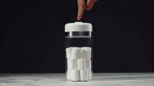 SHELBRU Smart Canisterは、ボタン一つで自動で真空状態を作り出す真空容器だ。15秒で最大20kPaの圧力をかけて真空状態にし、ボタンを押すだけで真空解除も可能となる。酸化や湿気、ホコリからしっかりと内部の食材を守り、長期保存を実現する。