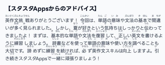 スタディスタジオ株式会社(本社:東京都渋谷区、代表取締役 鈴木孝一、以下「当社」)は、英検(R)受験生向けWebサービス「スタスタApps」において、新たに意見論述問題の添削結果に“ルビ(振りがな)”を付与する機能を2025年2月5日よりリリースいたしました。近年は小学生でも英検(R)3級・準2級・2級を目標にするケースが増え、当社のAIライティング添削を活用するユーザーの年齢層が広がっています。しかし、解説本文に難読漢字が含まれることが多く、「せっかくのフィードバックを一部読めない」という声が寄せられていました。今回のアップデートで小学生でも漢字をスムーズに読み解き、“英作文力”向上につなげやすくなります。