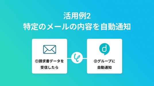 GmailやOutlookなどで「請求書」が件名に入っているといった特定の条件のメールを受信したらdirectに通知やメール本文をトークに投稿できるようになります。手動で通知する手間なくグループトークに情報を共有することが可能になります。また要約オペレーションを挟むことで、メール本文の要約をトークに投稿することも可能です。
