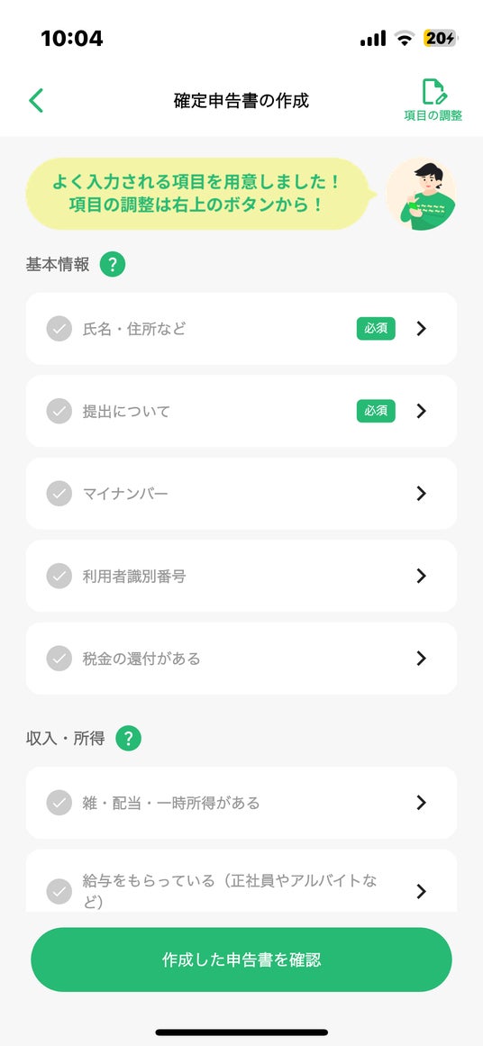 氏名や住所などの基本情報や、ふるさと納税、医療費等の必要な情報をガイドに沿って入力するだけで確定申告書類を自動で作成できます。