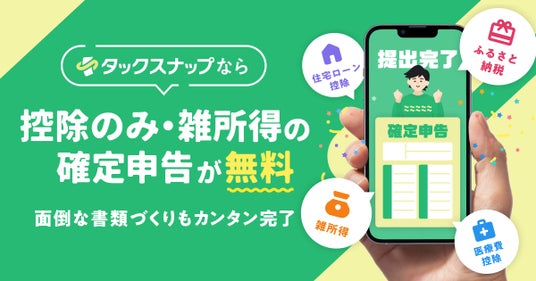 タックスナップ、控除のみ・雑所得の確定申告が無料に! 会社員のふるさと納税・医療費控除・副業(雑所得)などの申告がアプリで無料完結