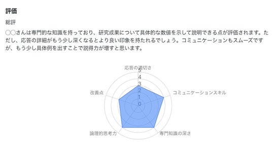 回答内容は自動でテキスト化され、論理性やコミュニケーションスキルの観点からフィードバックが提供されるため、弱点が明確になり、改善がスムーズに進みます。