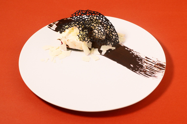 大胆かつ繊細な線はチョコレートを用いて視覚的に表現し、チュイルにより食感でも変化を加えました。さらに、リッチでボリューミーなマスカルポーネが、王道とは一味も二味も違う、病みつきになる魅力をもつティラミスに仕上げています。