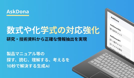 株式会社GFLOPS(本社:東京都渋谷区、代表取締役CEO:盛本マリア、共同代表:鈴木亮祐、以下、当社)は、法人向け生成AIアシスタント「AskDona(アスクドナ)」において、数式や化学式を含むデータ抽出機能を新たに実装し、本日より提供を開始いたしました。これにより、研究開発部門において、従来は対応が難しかった研究レポートや技術資料からの情報抽出・分析が大幅に効率化され、生成AIを活用した企業の研究活動を一層サポートいたします。