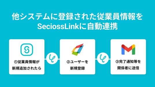 本連携により、例えば「SmartHRに新入社員の情報が追加されるとSeciossLinkに情報を渡し、SeciossLinkアカウントを作成して管理者や新入社員にGmailで必要情報を通知する」などの、これまで手動操作が必要だった業務を自動化するフローの作成が可能になります。