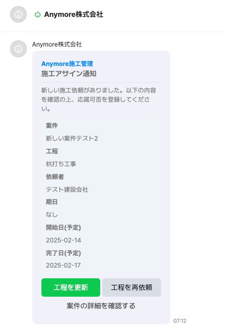 「Anymore施工管理」で工程を依頼すると、LINE WORKSの個人チャットに自動通知が届き、現場担当者は「Anymore施工管理」のアプリを開かずとも、工程の確認をはじめとする各種操作が可能になります。