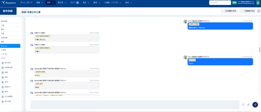 LINE WORKSのチャットの内容が自動的に「Anymore施工管理」と同期され、案件に紐づけてチャットの履歴を管理することができるようになります。案件に関する全てのコミュニケーションを「Anymore施工管理」に蓄積することができるため、担当者の引き継ぎも簡単です。