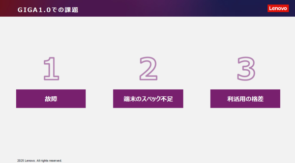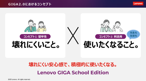 GIGA1.0(小中学校シェア)において同社は、No1のシェアを実現したとした一方で、故障・端末のスペック不足・利活用の格差などの課題があり、「壊れにくい安心感で積極的につかいたくなるデバイス」が必要だという気づきも得たという。