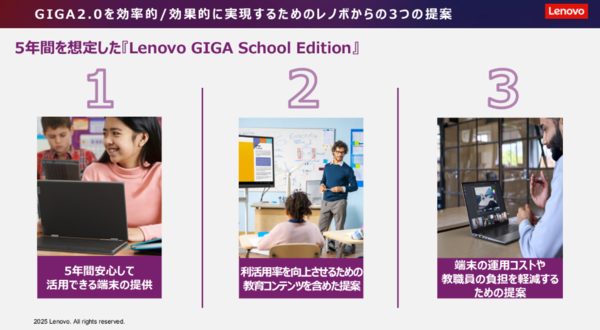 それを受けてNEXT GIGAといわれるGIGA2.0ではLenovo GIGA School Editionを展開。これは、5年間安心して活用できる端末の提供、利活用率を向上させるための教育コンテンツを含めた提案、端末の運用コストや教職員の負担を軽減するための提案をするデバイスとソリューションのパッケージとなっている。