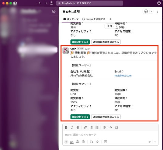 「GRiX」とSlackを連携させることで、閲覧通知をSlack上で確認できます。より即時的な対応や部署内でのスムーズな情報共有や対応連携が可能になります。