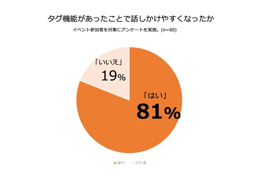 タグ機能で話しかけやすくなったかどうか参加後アンケートで調査をし、81%の方が話しかけやすくなったことを実感。共通点が見つけやすく会話のきっかけになったという声を多くいただきました。