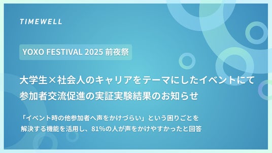 株式会社TIMEWELL(本社:神奈川県横浜市、代表取締役:濱本隆太、以下TIMEWELL)は、2025年1月24日YOXO FESTIVAL 2025の前夜祭として大学生×社会人のキャリアをテーマにしたイベント「FUTURE CAREER PARTY」を開催しました。本イベントでは、参加者交流促進の実証実験も合わせて実施し、「イベント時、他の参加者へ声をかけづらい」という困りごとを解決するためイベントアプリケーション「TIMEWELL BASE」のタグ機能を活用しました。結果、30名の社会人と100名の学生参加者のうち、81%の人が声をかけやすくなったと回答しました。