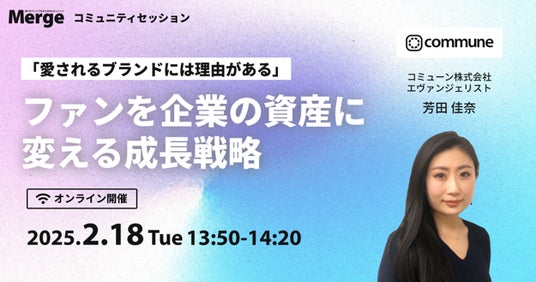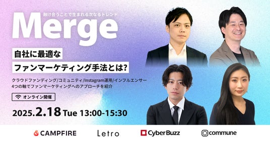 コミューン株式会社は、2025年2月18日(火)にオンラインカンファレンス「Merge」を開催することをお知らせいたします。本カンファレンスは、「クラウドファンディング」「コミュニティ」「Instagram運用」「インフルエンサー」という4つのセッションテーマをもとに、参加企業のみなさまが自社にとって最適なファンマーケティング手法を見つけることを目的としています。