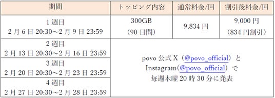 なお、 2 週目以降のセール内容は povo 公式 X(@povo_official)と、 Instagram(@povo_official)で午後8時30分にお知らせします。