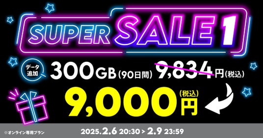 「povo Super Sale」では、毎週木曜日午後8時30分から期間限定で、対象のトッピングを通常よりおトクな料金で提供します。1週目は、通常9,834円の「300GB(90日間)」を9,000円で提供し、30日間あたり100GBを3,000円で利用できます。