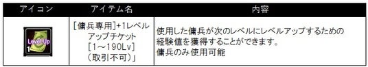 新傭兵実装前日までの7日間にゲーム内へログインすると、イベント期間のログイン日数に応じて、傭兵をレベルアップさせることができる「[傭兵専用]+1レベルアップチケット[1~190Lv](取引不可)」を最大10枚プレゼントいたします。