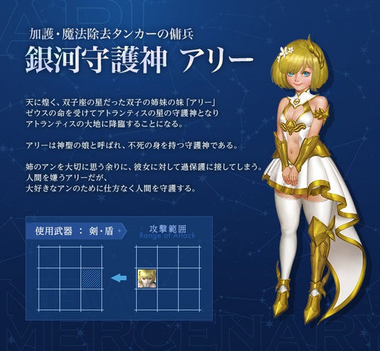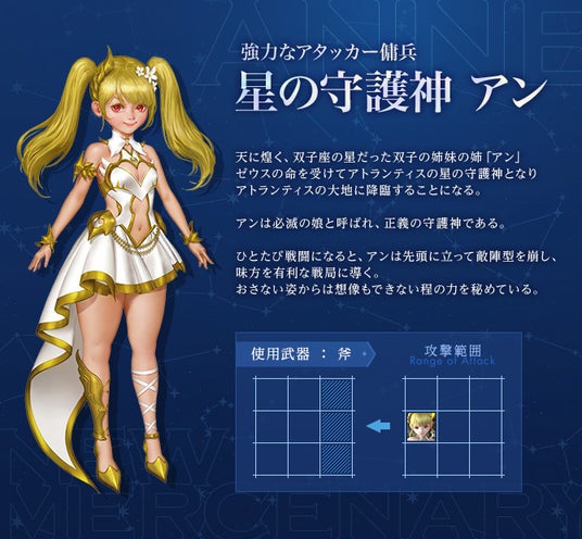 『アトランティカ』におよそ2年ぶりとなる新傭兵、双子座の星の化身「アン」と「アリー」が登場します。2人はゼウスの命を受けてアトランティスの星の守護神となり広大なアトランティスの大地に降り立ちます。星の力を宿した双子の傭兵は、主人公を支える強い味方になるでしょう。