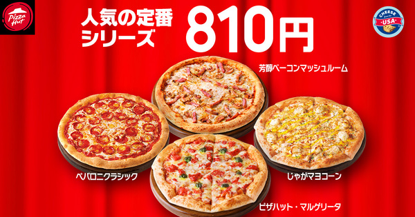 今月は「じゃがマヨコーン」「ピザハット・マルゲリータ」「芳醇ベーコンマッシュルーム」「ペパロニクラシック」の4種類が対象となり、通常価格1860円のピザが810円で購入できます。