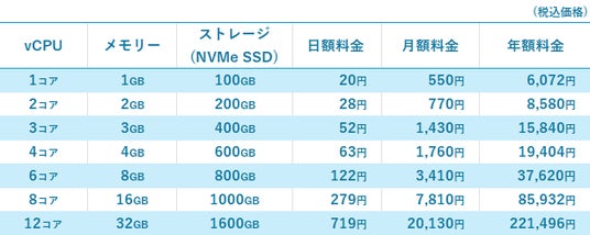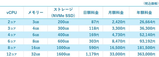 CPU/メモリーは1コア/1GB~12コア/32GBまで、ストレージは100GB~1600GBまで選択できます。