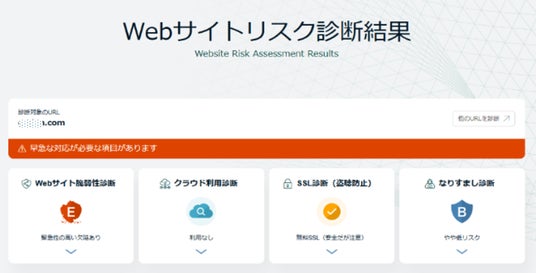 WebサイトのURLを入力し、本人確認するだけで、脆弱性診断・クラウド利用診断・なりすまし診断・盗聴診断の結果が確認できます。