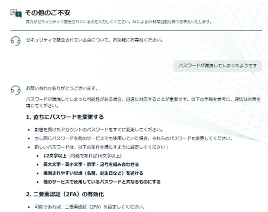 「セキュリティ相談AIチャットボット」は、GMOインターネットグループのAIエンジニアが、グループセキュリティ各社の知見を学習させ、特別に訓練して開発したAIが、24時間365日、セキュリティの不安や疑問に回答します。