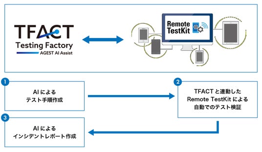 今回の取組みは、AGESTが展開しているAI機能を標準搭載したテスト管理ツール「TFACT」の次世代技術と「Remote TestKit」を連携させ、実機環境におけるテスト検証の大幅な効率化を目的としています。