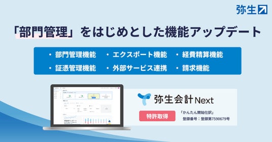 弥生株式会社(本社:東京都千代田区、代表取締役 社長執行役員 兼 CEO:武藤健一郎、以下「弥生」)は、先行体験プログラム実施の「弥生会計 Next」において、部門管理をはじめとした複数機能を実装したことをお知らせします。また、特許を出願していた「かんたん開始仕訳※1」が設定登録され、特許証が発行されたことを併せてお知らせいたします。