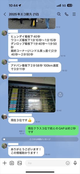 グリッドで集合写真を撮影し、エースの土屋選手にスタートドライバーを託します。1周の最速タイムが定められているこのレースでは、順位を上げるチャンスは限られており、低速からスタートするオープニングラップもその数少ないチャンスのひとつです。そのため、どのチームもサーキット経験が豊富なドライバーがスタートを務めることが多いのです。グリーンシグナルでスタートし、順調に土屋選手は総合3位をキープして1回目のピットストップへ。