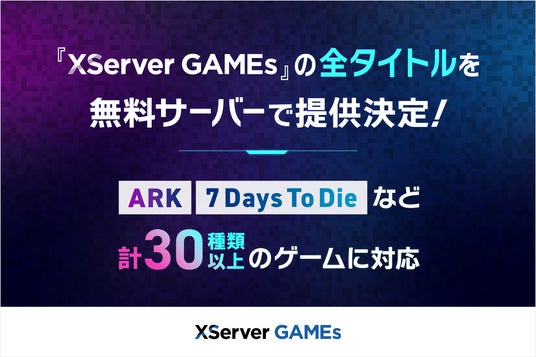 エックスサーバー株式会社(所在地:大阪市北区、代表取締役:小林 尚希)は、2025年2月7日、ゲームサーバー専用サービス『XServer GAMEs』において、無料サーバー提供を大幅に拡充することを決定しました。これまで「マインクラフト」や「Core Keeper」など7タイトルの無料サーバーを提供してまいりましたが、これらが予想以上の反響をいただいたことを受け、今後は「ARK」や「7 Days To Die」を含む、現在提供中の全タイトル(計30種類以上)に対して無料サーバーの提供を拡大します。
