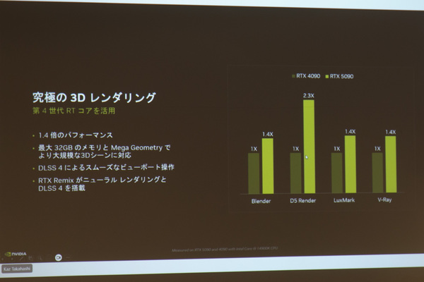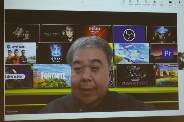 さらにRTX 50シリーズは、クリエイター向けの機能も大幅に進化している。高橋さんが取り上げた項目は、4:2:2デコードとエンコードの対応、“Studio Voice”による高品質な音声収録、“Virtual Key Light”の自然な照明、第4世代RTコアと大容量VRAMがもたらす大規模なシーンのリアルタイムレンダリングなどだった。