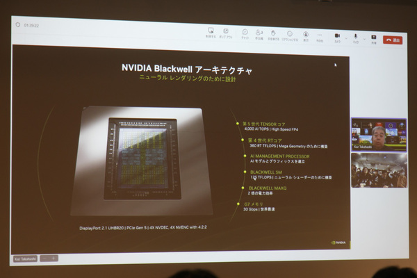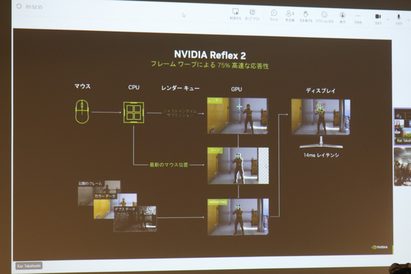 高橋さんはNvidia Blackwellアーキテクチャーの特徴をひとつずつ紹介。なかでも力を入れていたのは、ゲーミング性能の大幅な向上。“DLSS 4”のマルチフレーム生成の有効性や対応ゲームの本数、“Nvidia Reflex 2”の応答速度向上などを解説した。