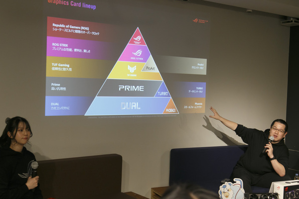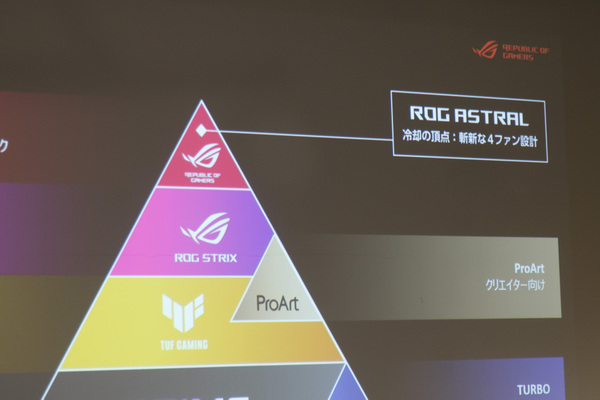 ジョージさんはまず、ASUSが展開するブランドをスライドで紹介。スクリーンに映し出されたピラミッド状の図には、“Prime”や“TUF Gaming”などが記されており、頂点に“ROG Astral”の文字が書かれていた。これはASUSの最高級ブランドとして新設されたグレードで、RTX 50シリーズのフラッグシップモデルが該当する。