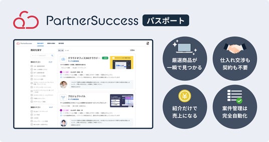 パートナーサクセス株式会社(本社:東京都港区、代表取締役 永田雅裕、以下「パートナーサクセス」)は、BtoB商材マーケットプレイス「PartnerSuccess パスポート」をベータ版として提供を開始いたします。代理店契約不要で、いますぐだれでも、インフラ、リース/ローン、金融、サービス、ソフトウェアなどの商材を取り扱うことができる紹介代理店向けマーケットプレイスです。