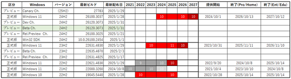まずは、現状を確認したい。以下の表は、現在のWindows 10~11とプレビューの状態を示すものだ。