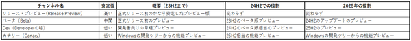 24H2のプレビューに関しては、役割の変更があった。ただし、リリースプレビュー・チャンネルの役割には変更がなかった。現状、23H2と24H2で独立して配布されている。このチャンネルは開始時のバージョンのプレビュー版を更新し続ける。