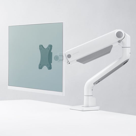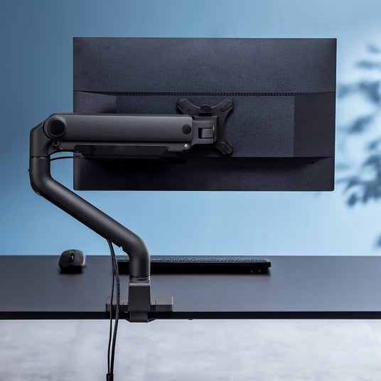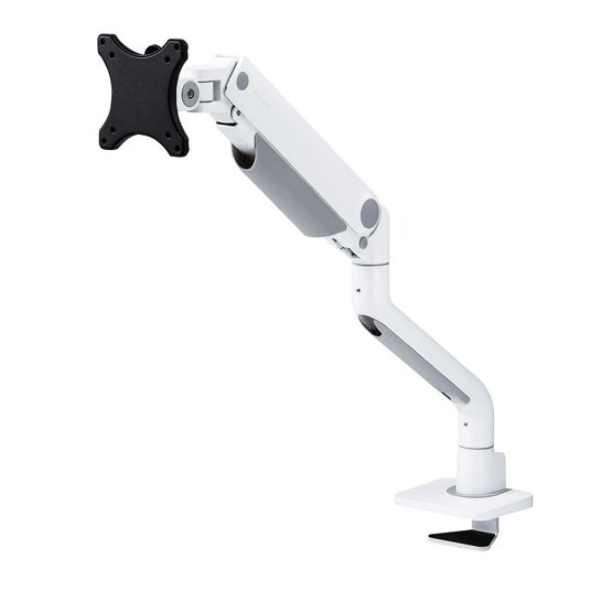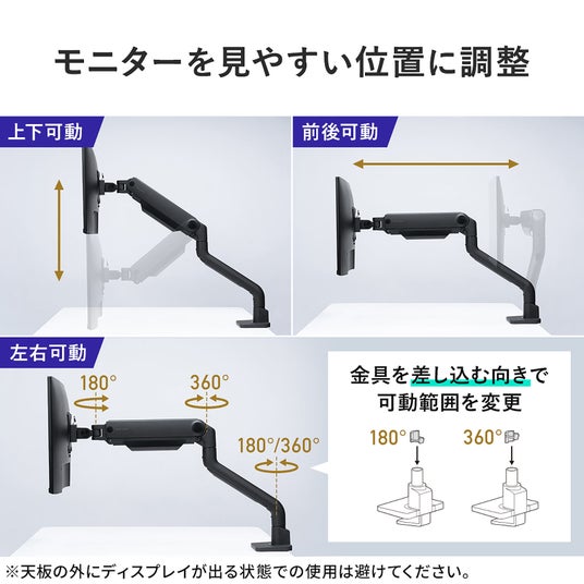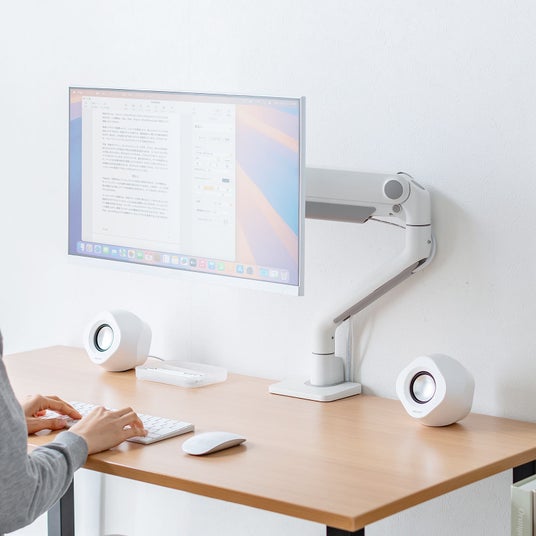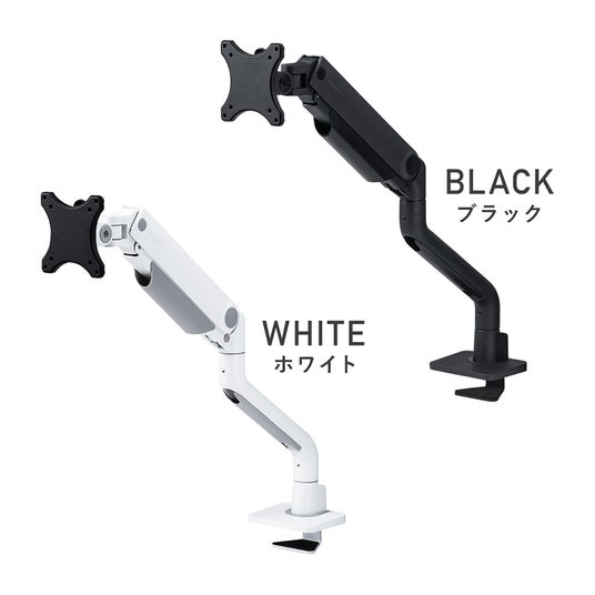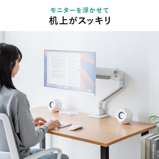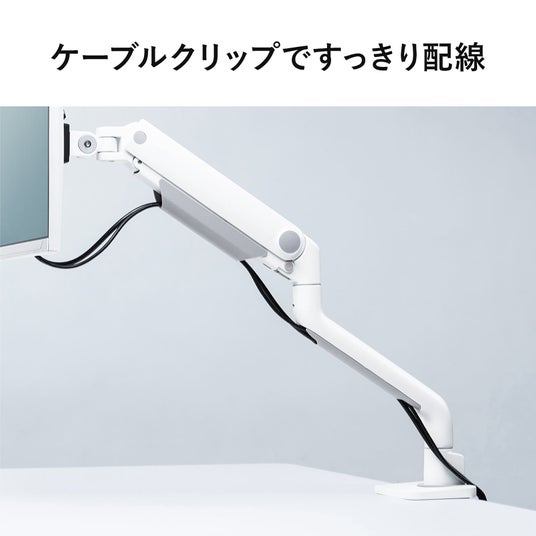 このモニターアームは、ガススプリング内蔵の4軸タイプで、モニターの高さをスムーズに調整できます。目線に合わせて簡単に上下調整が可能なため、作業の疲れを軽減し、より快適な作業環境を提供します。デスクワークをもっと快適にしたい方におすすめです。