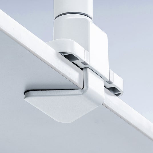 上からネジを締めるだけで簡単に設置でき、デスク背面に回ることなく正面から組立てが可能です。クランプは天板下の出っ張りがわずか6mmとコンパクトで、設置制限が少ないため、狭いスペースでも問題なく使用できます。
