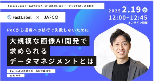 今回の選出を記念して、2025年2月19日(水)12時より「大規模な画像AI開発で求められるデータマネジメントとは ~PoCから運用への移行で失敗しないために~」と題したウェビナーを開催します。当日は当社の執行役員 CPOである内田 修平が、大規模な画像AI開発で直面する課題や失敗を回避するためのポイントを紹介しながら、効率的なワークフローの構築、品質管理、データセキュリティ確保といった具体策を解説します。