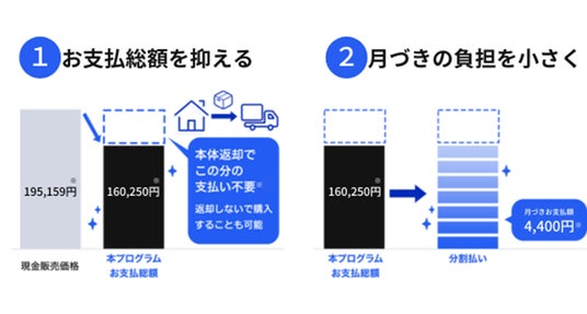 本プログラムは、利用期間終了後にデバイスを返却することを前提として、残存価値をあらかじめ除いた金額でAppleデバイスを購入することができるサービスで、お支払いは利用期間内の分割払いとなります。Appleデバイスの高い残存価値を反映した仕組みにより、月づきのお支払額とお支払総額の両方を抑えることができます。