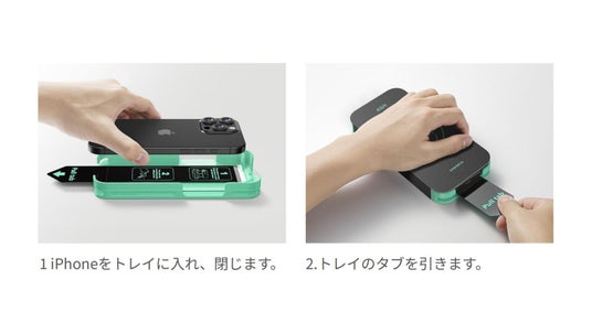 従来商品の強化ガラス製スクリーン保護フィルムでは、付属のアライメントフレームを縁合わせをし、上から新しいフィルムを被せる方法でしたが、Armoriteスクリーン保護フィルムではアップグレードした付属の箱型UltraFitトレイに、スマホスクリーンを下向きにしてセットし蓋を閉めて、蓋を抑えながら引き抜きタブを引くだけなので、セットしてからわずか3秒間で貼り付けを行えます。また、静電気によって画面上の微細なホコリを吸い付けながら貼付けが行え、気泡混入を最大限に防ぎながらスクリーン保護フィルムの貼付けが行えます。